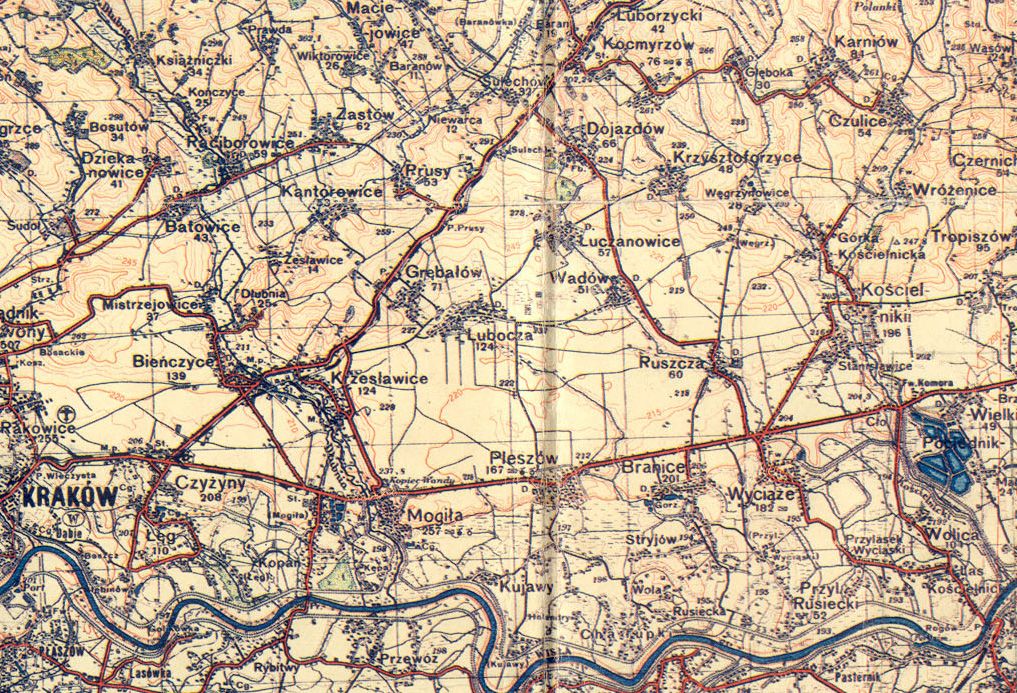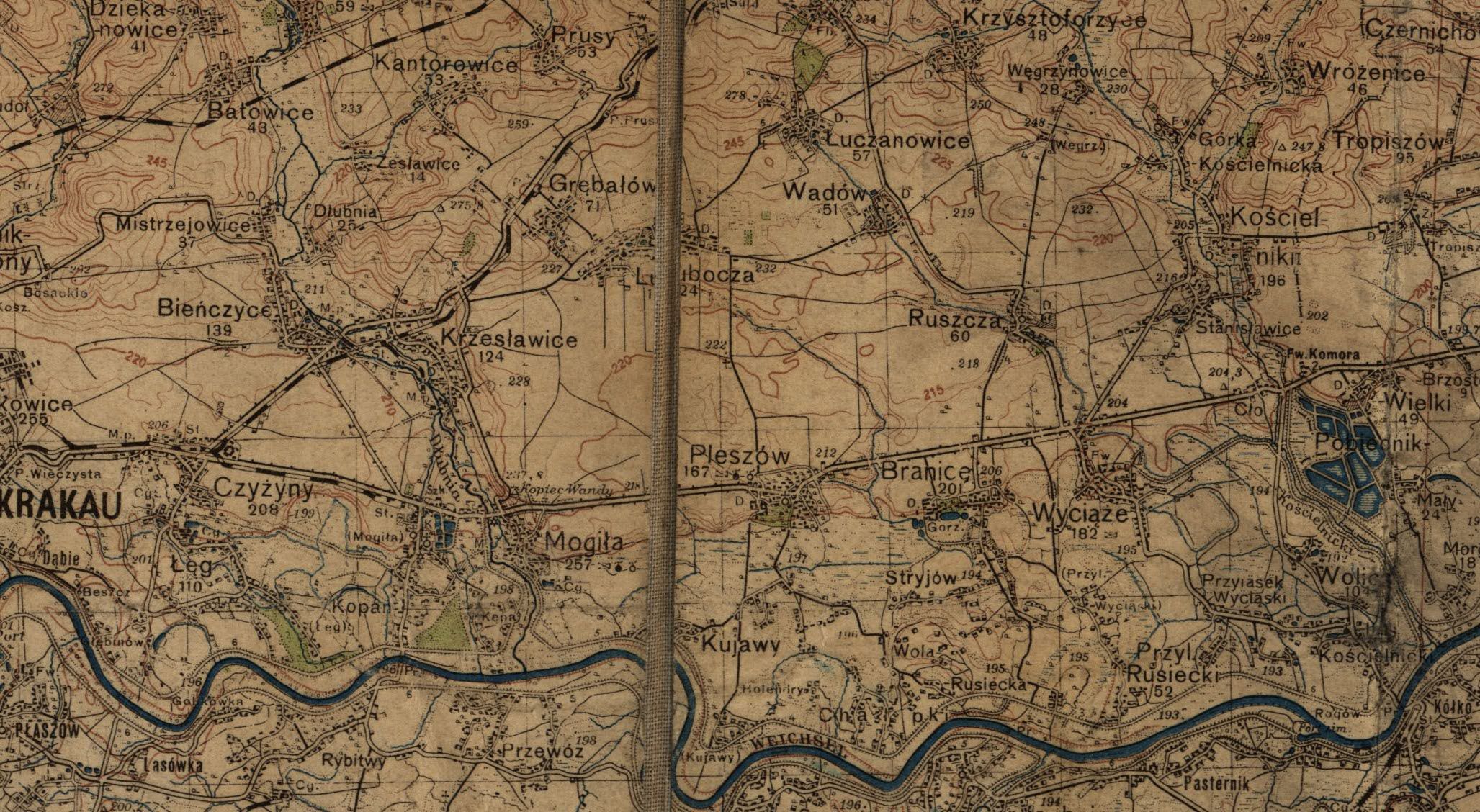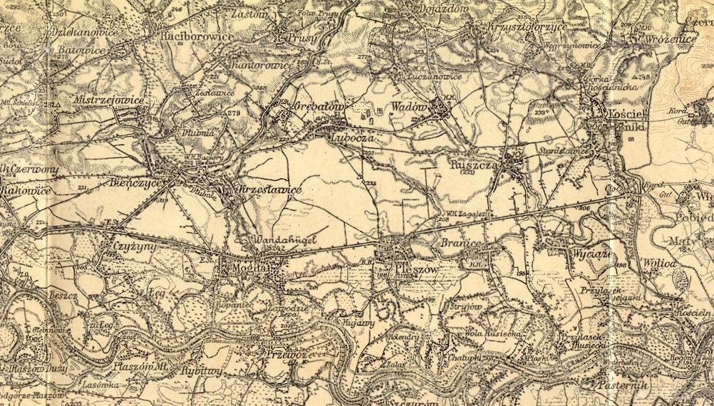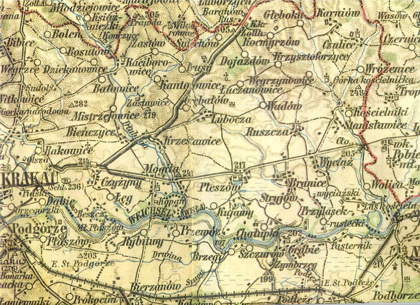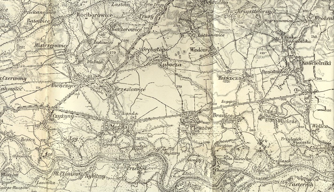 fragment mapy obejmujący miejscowości: Mogiłę, Krzesławice, Grębałów, Luboczę, Wadów, Ruszczę, Pleszów, Branice