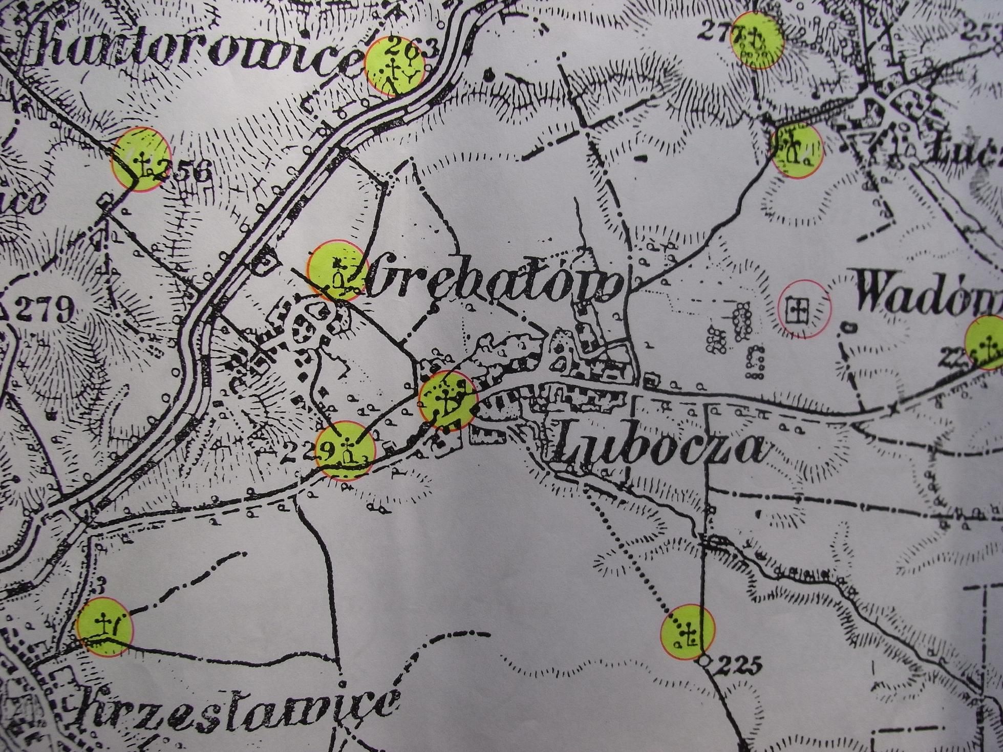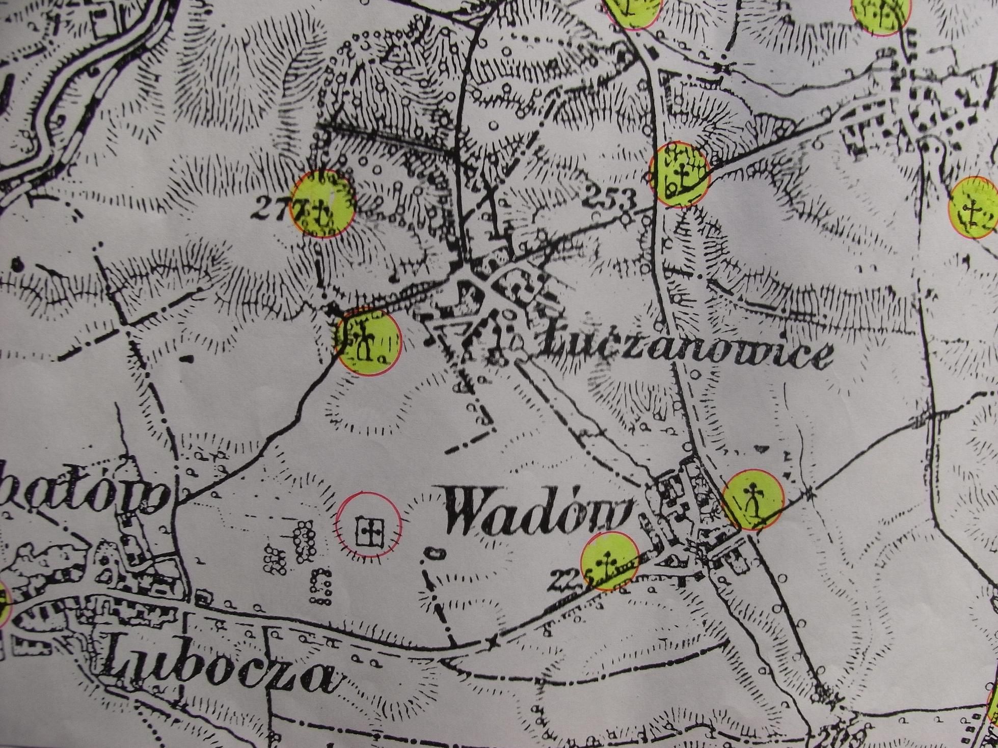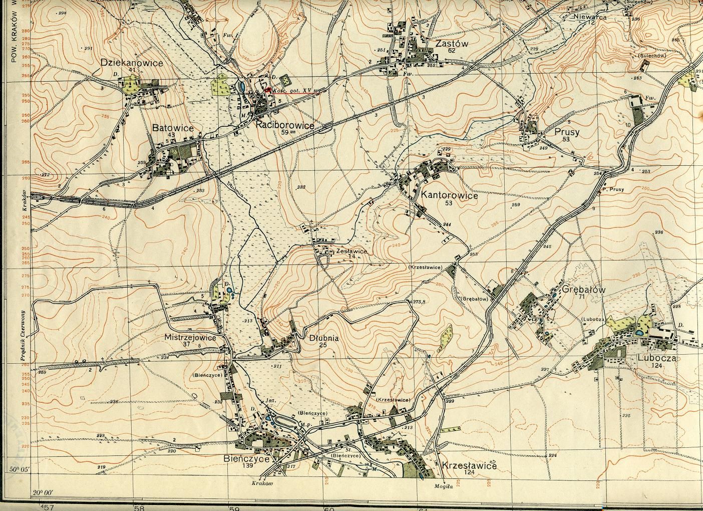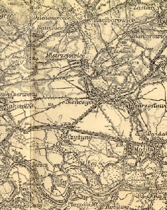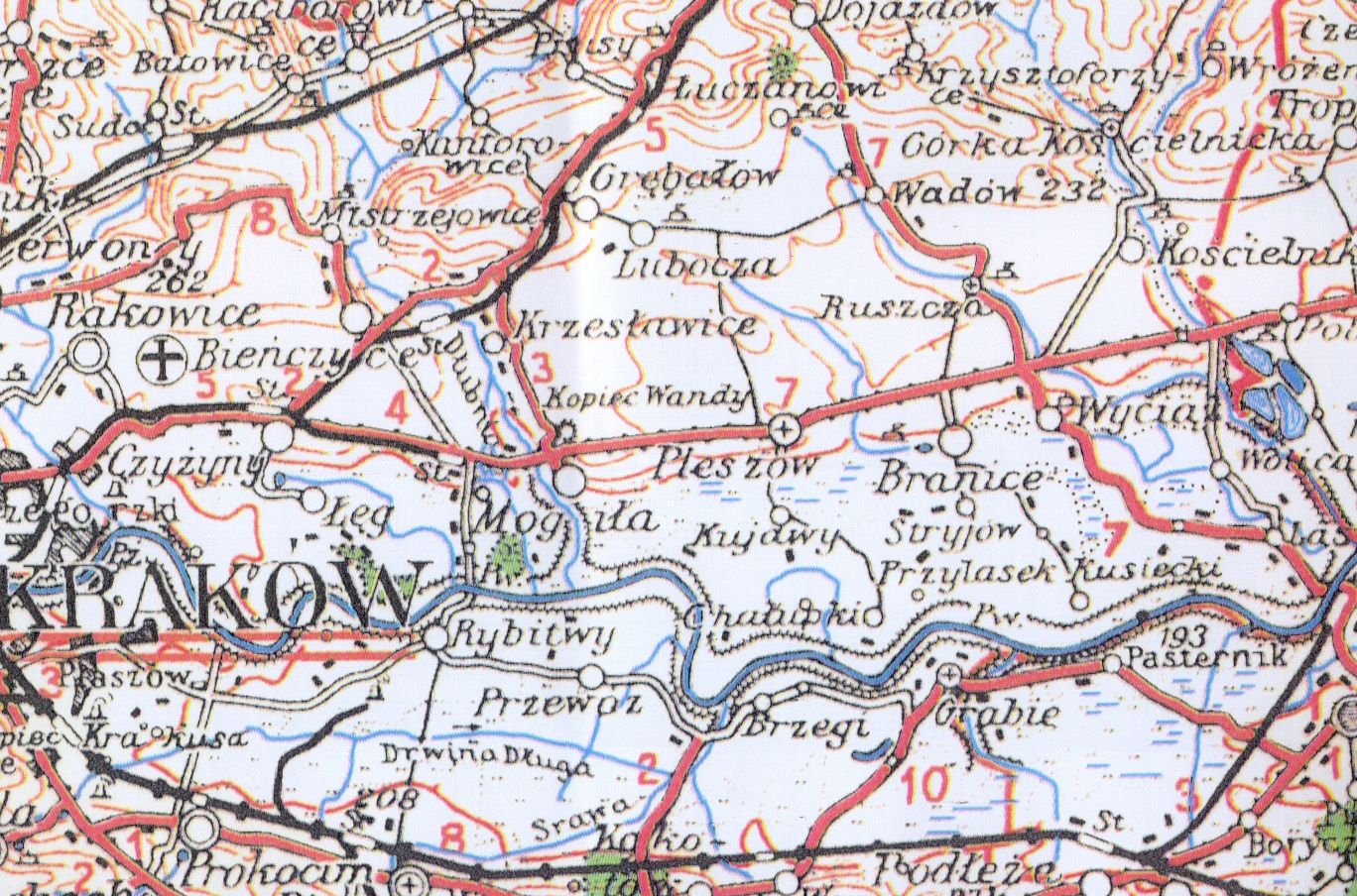 fragment mapy obejmujący miejscowości: Mogiłę, Krzesławice, Grębałów, Luboczę, Wadów, Ruszczę, Pleszów, Branice