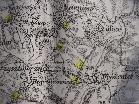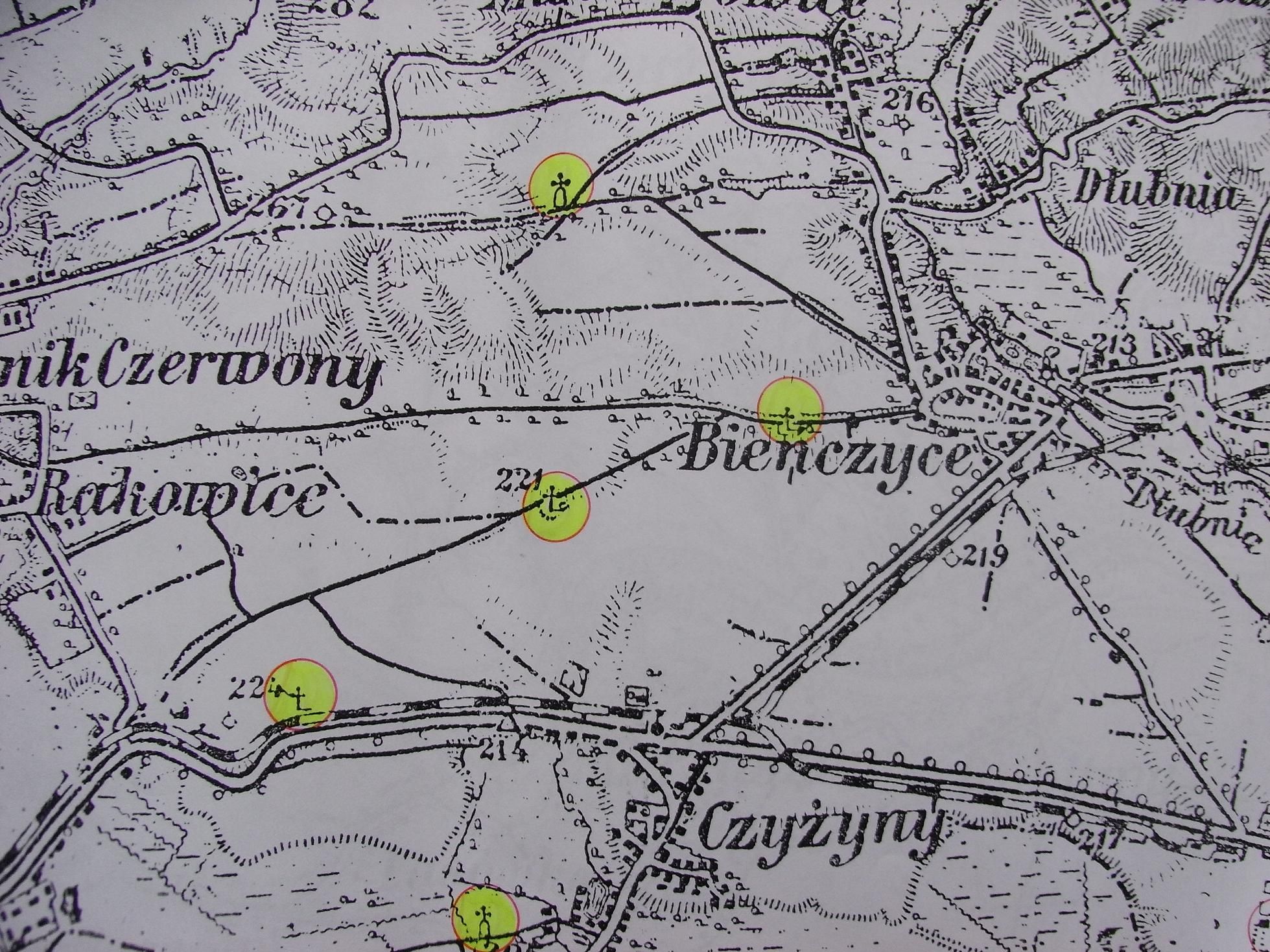 fragment mapy dołączonej do "Przewodnika po okolicach Krakowa" Klemensa Bąkowskiego - z zaznaczonymi kapliczkami i krzyżami przydrożnymi